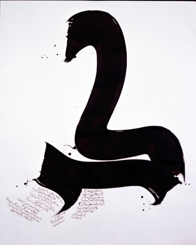 This bold artwork includes the inscriptions from a poem narrated by the first Abbasid Caliph, Abu Jaafar Al Mansour, he comments on the injustice of the society of the day and laments its unconcern for the plight of the poor. From Kitab Al Mustatraf and Kitab Al Mu’talaf wa Al Mukhtalaf. There is also text around the bold letter that provides an explanation of the term Maghribi, written in Ermes’ characteristic cursive style that is itself intentionally reminiscent of the Maghribi script. The original artwork was produced in 1991, ink on paper, the size of which is approximately 153cm x 123cm. This artwork is in the collection of the British Museum, it is currently part of the ‘Mightier than the Sword – Arabic Script: Beauty and Meaning’ touring exhibition that was held in The Potter Museum, Melbourne, Australia and is currently in the Islamic Arts Museum in Kuala Lumpur, Malaysia.