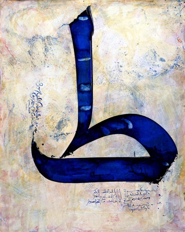 Artwork by Ali Omar Ermes with a quotation from the poet Salm Al Khaser cites the attributes of a great personality. Ink and acrylic on paper mounted on canvas. 150 cm x 120 cm.
