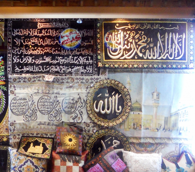 A shop in Makkah displaying a selection of decorative Arabic embroidery